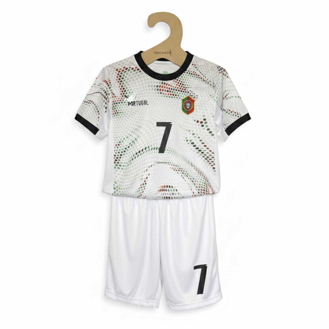 O conjunto é uma réplica de um equipamento de futebol, provavelmente destinado a fãs ou como recordação turística, associado ao famoso número 7 da seleção de Portugal.